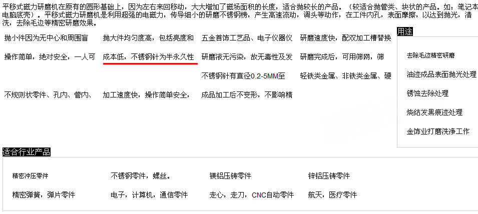 平移式磁力研磨機在原有的圓形基礎(chǔ)上,因為左右來回移動,大大增加了磁場面積的長度,適合拋較長的產(chǎn)品。(較適合拋管類、塊狀的產(chǎn)品。如: