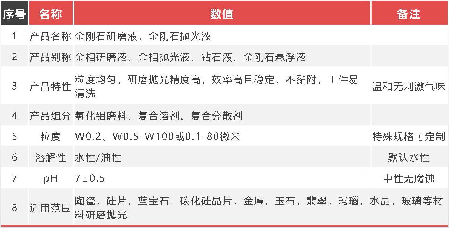 金剛石研磨液粒度均勻,研磨拋光精度高,效率高且穩(wěn)定,不黏附,工件易清洗